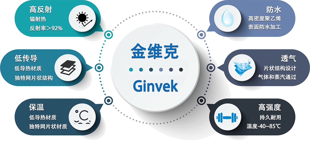 在外部環(huán)境,尤其是夏季高溫環(huán)境中,太陽輻射熱才是建筑物及其內(nèi)部溫度升高的主要來源。利用金維克材料對(duì)農(nóng)場(chǎng)建筑進(jìn)行防護(hù)(屋頂,側(cè)墻等),能夠極大降低太陽輻射熱帶來的溫度影響,切斷升溫主要來源,從而減緩室內(nèi)溫度的上升,為生物提供事宜的環(huán)境溫度,同時(shí),利用金維克材料的紫外反射特性及一定的阻水能力,還可以改善老舊建筑容易吸熱,吸水等缺陷,進(jìn)一步給養(yǎng)殖環(huán)境提供可靠的“防護(hù)屏障”。